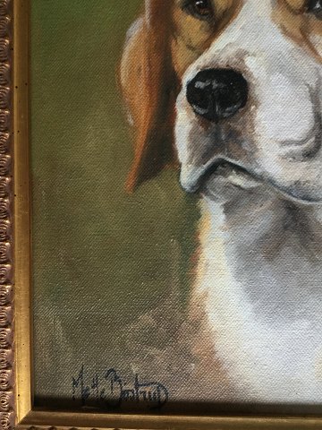 Mette Bøstrup (født 1961): Portræt af en hund. Olie på lærred. Sign.: Mette Bøstrup 30x24 (43x37)