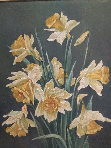 Anna Wittorff (20 årh): Påskeliljer 1919. Olie på lærred monteret på pap. Sign.: A. Wittorff 1919 Bagpå forskellige dedikationer og info om malerinden. 62x52 (70x60)