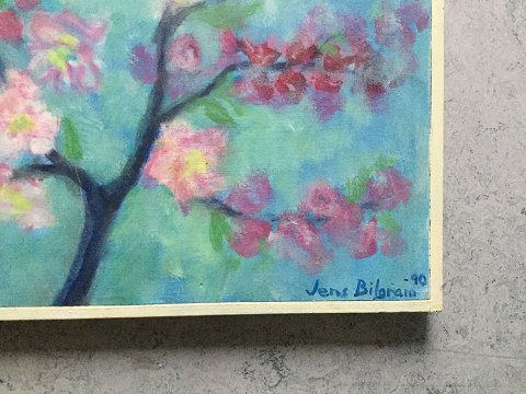 Jens Bilgram (1937-2013): Blomstrende æblegrene 1990. Akryl på plade. Sign.: Jens Bilgram - 90. Bagpå - Æbleblomstring Maj 1990 - Jens Bilgram. Indrammet - 37x42