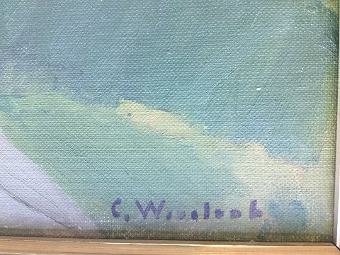 Ubekendt kunstner (20 årh): Person ved gård. Olie på lærred. Sign: C. Woonloob???? 33x39 (45x51)