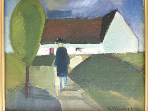 Ubekendt kunstner (20 årh): Person ved gård. Olie på lærred. Sign: C. Woonloob???? 33x39 (45x51)