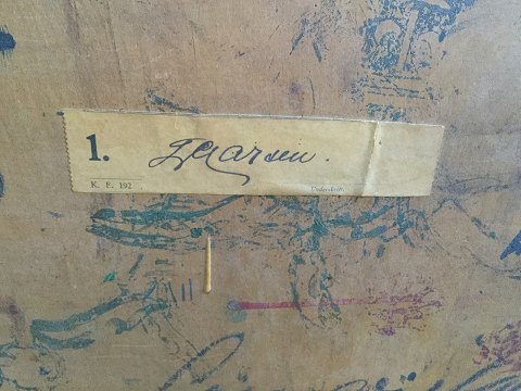 Bagpå - Olieskitse til Den Barmhjærtige Samaritan - L.C. Larsen samt udstillingsmærkat fra KE.