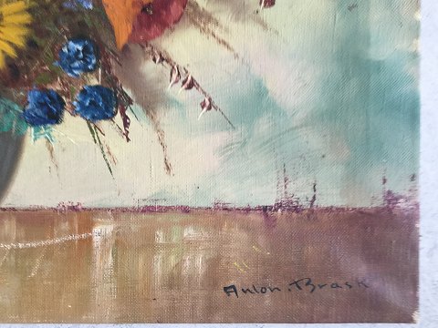 Anton Brask (20 årh): Markblomster i vase. Olie på lærred. Sign.: Anton Brask. uden ramme. 67x96