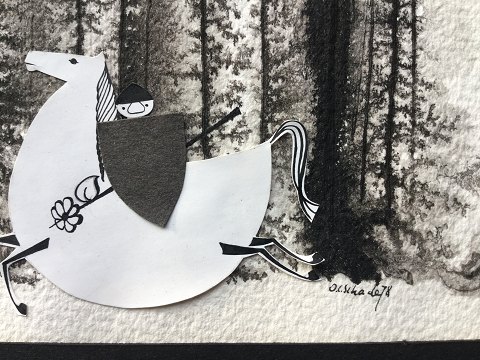 O.L. Schade (20 årh): Komposition med ridder i skov 1978. Akvarel/Papirklip på papir. Sign.: O.L. Schade 78. Monteret med sort passepartout. Uden ramme. 17x23 (29x39)