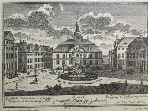 Ballermann & Søn: Rådhuset på gammel Torv i København. Litografisk tryk efter kobberstik af Jonas Haas og Johan Jacob Bruun. Indrammet 24x30