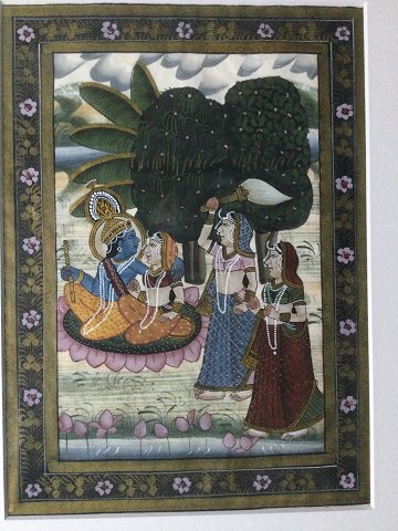 Ubekendt kunster (20 årh): Indisk motiv ? Personer i landskab. Bemalet silke. Indrammet 43X33