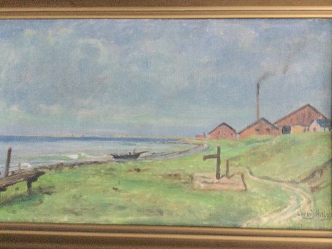 Ludvig Nielsen (født 1878): Kystparti fra Han Herred med et Teglværk. Olie på lærred. Sign.: Ludvig Nielsen 30x50 (39x59)
