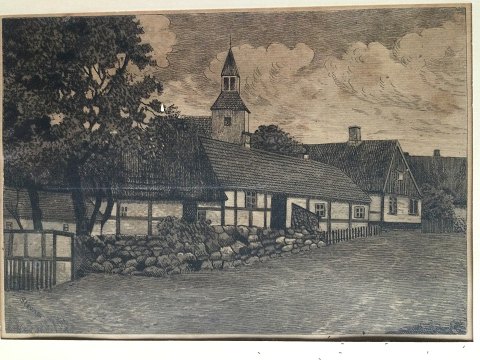 Axel Emil Jensen-Stevns (1879-1920): Gadeparti fra Gudhjem, Bornholm. Radering på papir. Signeret i trykket - Stevns. Små insekter bag glas. 17x24 (26x32)
