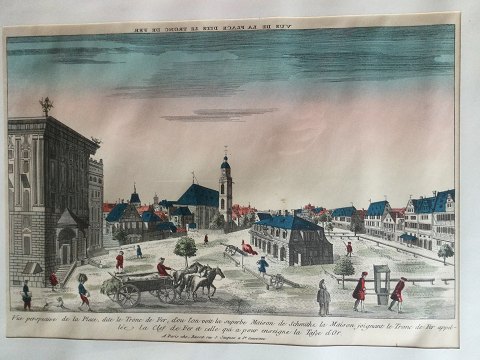Ubekendt kunstner (20 årh): "Vue Perspective de la place, dite le Tronc defer….." Senere tryk efter kobberstik 1760 Litografisk tryk. 29x41 (46x56)