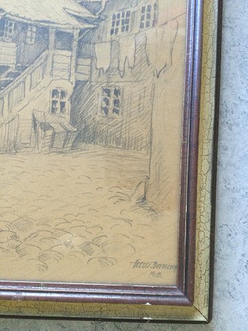 Vitus Borning (20 årh): Baggård med bindingsværkshuse, Christianshavn 1915. Bly på papir. Sign.: Vitus Borning 1915. 52x41 (58x47)
