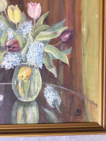 Ane Brügger (1908-95): Vase pĺ bord med tulipaner og hyacinter. Olie pĺ lćrred. Sign.: AB 43x46 (47x44) Brügger var uddannet i tegning hos Gerda Wichmann - ellers autodidakt.