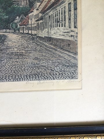 V. Holm (20 årh): Parti fra Køge med kirken i baggrunden. Farveradering på papir.. Sign.: V. Holm. Lille skjold i bund Indrammet 35x30