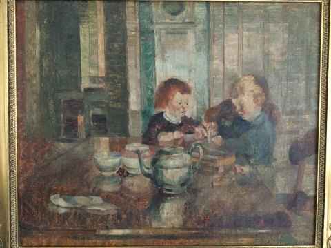 Ludvig Jacobsen (1890-1957): 2 legende børn ved tebordet. Olie på lærred. Sign.: Ludvig Jacobsen 48x59 (64x75) Ludvig Jacobsen var uddannet fra Teknisk Skole i København.