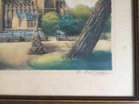 Leon LaCault (født 1866): Nortre Dame i Paris. Farveradering på papir. Sign.: L. Lacault 24x34 (34x44)