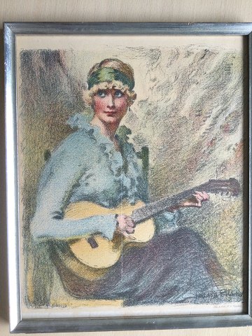 Frantosek Xaver Naske (1884-1959): Guitarspillende kvinde 1920'erne. Farvelitografi på papir. Sign.: F.X. Naske (i trykket) Indrammet 28x23