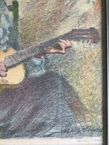 Frantosek Xaver Naske (1884-1959): Guitarspillende kvinde 1920'erne. Farvelitografi på papir. Sign.: F.X. Naske (i trykket) Indrammet 28x23