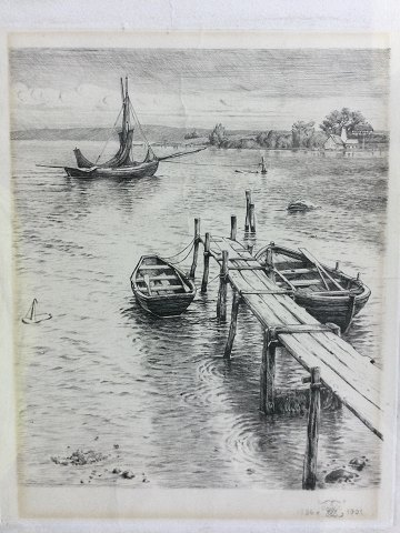 Peter Tom-Petersen (1861-1926): Badebroen, Troense 1901 Radering på papir. Sign.: Monogram 1886-1901 30x24 (33x27)