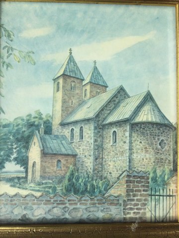 Torben Galle Jensen (1901-70): Fjenneslev Kirke 1963. Offsettryk på papir efter tegning af Torben Galle Jensen 1963. Sign.: T.G.J. 63 (bag rammen) Indrammet 22x19
