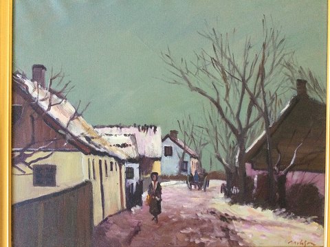 Willy Nilsson (1920-89): Landsbygade med personer, vinter. Olie på lærred. Sign.: nilsson 50x60 (60x70)