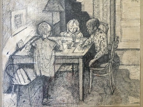 Ubekendt kunstner (20 årh): Børn tegner ved spisebord 1959. Tusch på papir. Sign.: jan 59 b. Bagpå tilskrevet Aksel Petersen 45x55 (58x70)