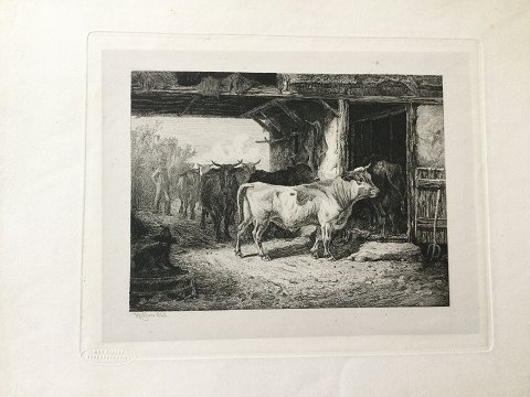 Johannes Vilhelm Zillen (1824-70): Kvæget vender hjem til stalden 1865 Radering på papir. Sign.: JVZillen 1865 DDRF 1872 Uden ramme. Bladet måler 28x36 (trykfladen 18x23) 27121