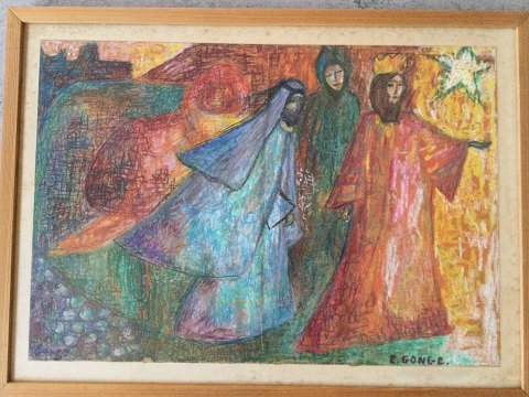 Erna Gonge (død 2009): De Hellige Trekonger. Pastel/oliekridt på papir. Sign.: E. Gonge Passepartout er snavset, men pastellen fin. 43x62 (52x71)