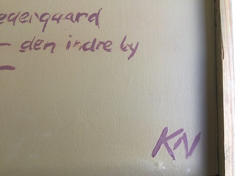 Kurt Nedergaard (født 1945): Gavle - den indre by 1987. Olie på lærred monteret på plade. Sign.: KN Bagpå - KN samt Kurt Nedergaard Bategnet bagpå - Gavle - Den indre by 1987. 21x25 (23x27)