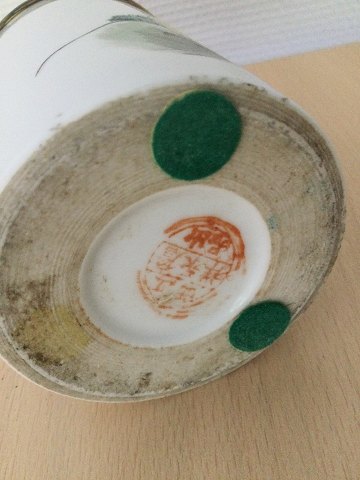 Polykromt dekoreret med kinesisk mand ved træ samt skriftstegn.