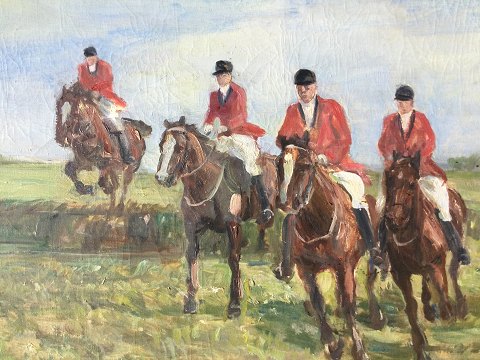 Thorvald Hansen (1878-1955): Hubertusjægere til hest i Dyrehaven. Olie på lærred. Enkelte krakeleringer. Sign.: Thorvald M. Hansen 55x80 (69x94) 32421