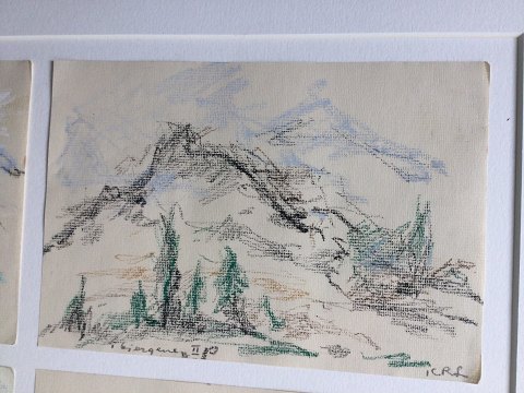 Ubekendt kunstner (20 årh): 4 bjerglandskaber i samme ramme. Oliekridt på papir. Indrammet i samme ramme uden glas. Betegnet "I Bjergene" nr. I, II, III og IV. Sign.: ICRL Indrammet 46x61 49121