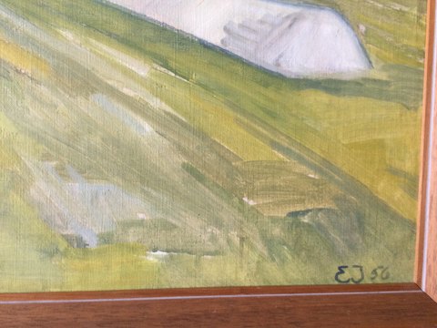 Ubekendt kunstner (20 årh): Landskab med fabriksskorstene 1956. Olie på lærred. Sign.: EJ 56. 49x60 (55x66) 49121
