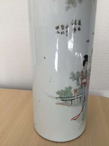 Polykromt dekoreret med skrifts tegn og scene med personer.