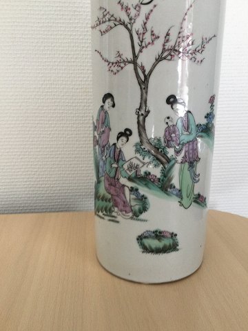 Polykromt dekoreret med skrifts tegn og scene med personer.