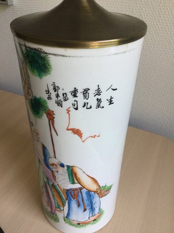 Polykromt dekoreret med skrifts tegn og scene med personer.
