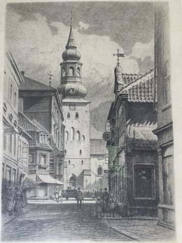 Peter Tom-Petersen (1861-1926): Algade, Aalborg med Budolfi Kirke 1920. Radering på papir. Sign.: P. Tom Petersen 1920 (bly) Nr. 10 I trykket - Aalborg Byvåben 29½x21½ (45x38) 46521