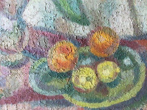 Otto Weber (1895-1967): Otto Aloys Xaver Weber Opstilling med blomsterbuket og frugtfad på bord 1950. Olie på plade. Sign.: O. Weber 50 83x101 (91x109) 26322