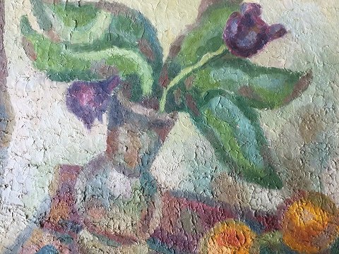 Otto Weber (1895-1967): Otto Aloys Xaver Weber Opstilling med blomsterbuket og frugtfad på bord 1950. Olie på plade. Sign.: O. Weber 50 83x101 (91x109) 26322