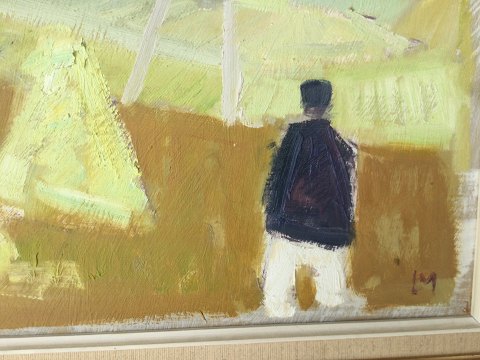 Leon Møller (1919-92): Høstakke, personer og telefonmast i landskab. Olie på lærred. Sign.: LM. Bagpå - Leon Møller 31x41 (45x55) 33022