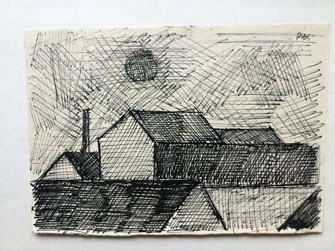 Peder Brøndum Sørensen (1931-2001): Fabriksbygninger Tusch på papir monteret på større ark 21x30. Sign.: PBS. Uden ramme. 14x20