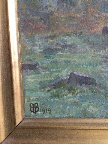 Brita Barnekow (1868-1936): Skovparti med dreng og ko i lysning 1919. Olie på lærred. Sign.: Monogam BB 1919. Lækker samtidig ramme. 53x32 (61x40)