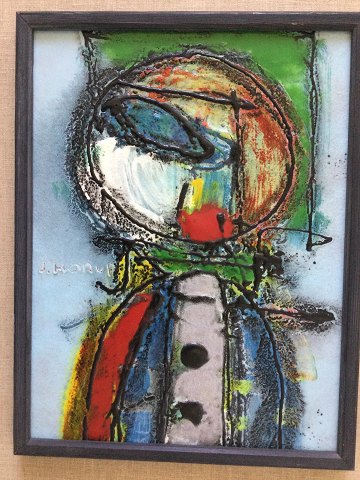 Jens Horup (20 årh): Abstraktion med person. Emalje på plade. Sign.: J. Horup 41x31 (62x52)
