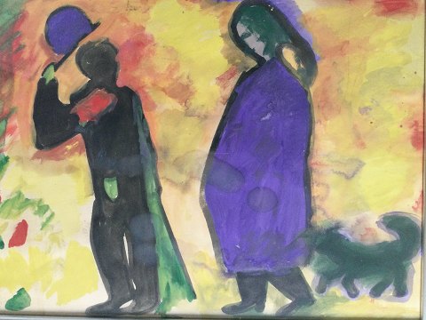Ubekendt kunstner (20 årh): Mand hilser på gravid kvinde 1965. Akvarel på papir. Sign.: W65 Bagpå titel - "Hilsen til den Frugtsommelige". Indrammet 57x76