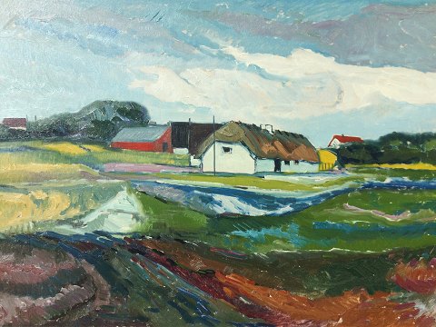 Aage Strand (1910-75): Gårde i landskab. Olie på lærred. Sign.: AS 67x97 (84x114) Åge Strand