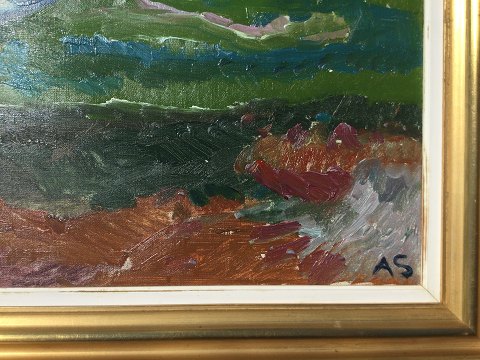Aage Strand (1910-75): Gårde i landskab. Olie på lærred. Sign.: AS 67x97 (84x114) Åge Strand