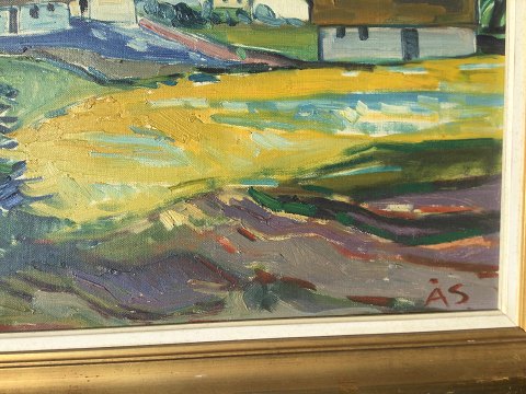 Aage Strand (1910-75): Kystparti med gårde. Olie på lærred. Sign.: ÅS 52x62 (66x77) Åge Strand