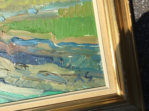 Aage Strand (1910-75): Kystparti med gårde. Olie på lærred. Sign.: ÅS 70x100 (85x115) Åge Strand