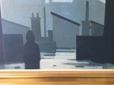 Knud Horup (1926-73): Person og bygninger i industrikvarter. Olie på lærred. Sign.: Horup 60x70 (79x89) 14723