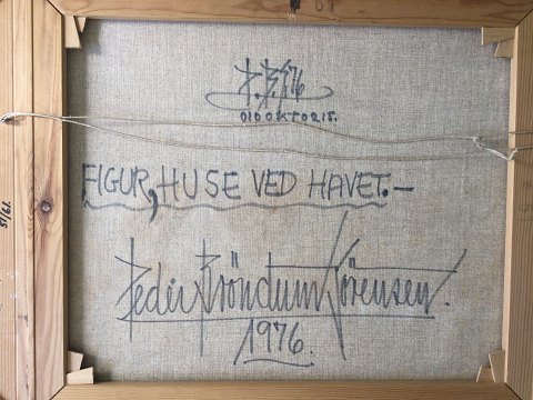 Peder Brøndum Sørensen (1931-2001): "Figur, Huse ved havet" 1976. Olie på lærred. Sign.: PBS. Bagpå - PBS 76 Peder Brøndum Sørensen 1976 - Figur, Huse ved Havet. 51x61 (65x75) 15023