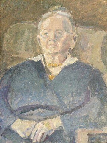 Jakob Agersnap (1888-1958): Siddende, ældre kvinde i interiør 1945. Olie på lærred, Sign.: Jakob Agersnap Bagpå lærred - Jakob Agersnap Esbjerg 1945. 55x41 (65x51) 9312