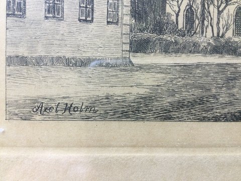 Axel Holm (1861-1935): Byparti med kirke. Radering på papir. Sign.: Axel Holm ( i trykket) 21x24 (24x27)
